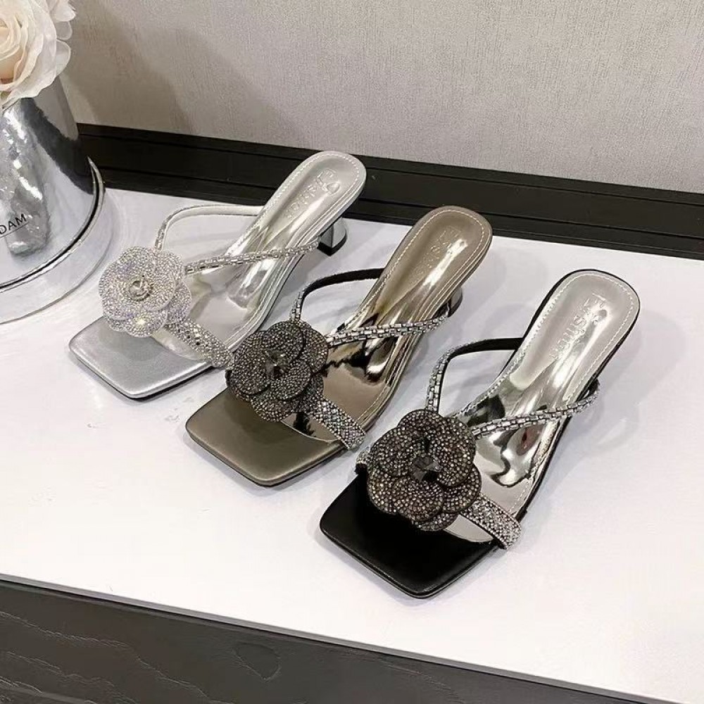 Rhinestone Camellia Toe-Post Kitten Heel Mules